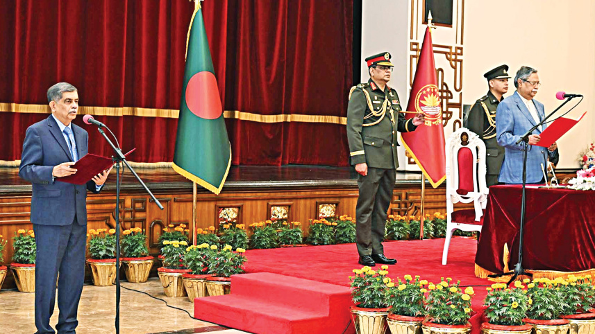 President Mohammed Shahabuddin administering the oath of office to new Education Adviser CR Abrar at the Bangabhaban yesterday. Photo: PID