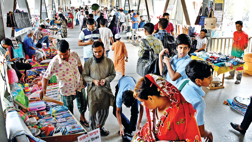 In Dhaka, vendors have taken over not only the footpaths but also the footbridges, leaving little space for pedestrians. Despite the daily inconvenience this causes, the problem persists without intervention. This photo was taken from the Farmgate footbridge yesterday. Photo: Palash Khan