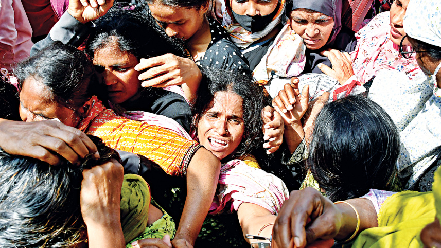 Buyers push and shove for subsidised essential commodities as soon as the TCB truck carrying supplies enough for 200 people arrives in the capital’s Shyamoly area around noon yesterday. Every day, people from low-income groups, who are unable to keep up with the soaring market prices of essentials, wait for hours for TCB trucks at various locations around the capital. Photo: Palash Khan