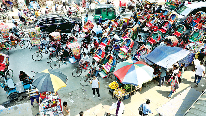 Rickshaws waiting for passengers occupy almost the entire road near Holy Cross College in the capital’s Farmgate area. It causes severe inconvenience to vehicular movement. The photo was taken around noon yesterday. Photo: Prabir Das