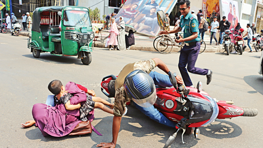 A man, his wife, and their daughter fall off a motorbike on Sadar Road in Barishal city, as a police officer rushes to help the family. Neither the woman nor the child was wearing a helmet at the time of the accident yesterday morning. Thankfully, they escaped with minor injuries. Photo: Titu Das