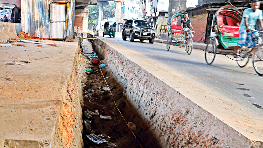 This road in the Khilgaon area was cut by Titas Gas to set up gas lines in the area. As a result, pedestrians or speeding vehicles could fall into this gap by accident at any time. The photo was taken yesterday. Photo: Anisur Rahman