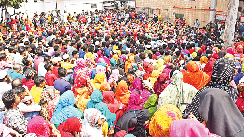 Hundreds of workers sit on the ground in front of Shinest Apparels, demanding festival bonuses before Eid, which is less than two weeks away. The photo was taken at Mohammadpur Beribandh in the capital yesterday morning. Photo: Palash Khan
