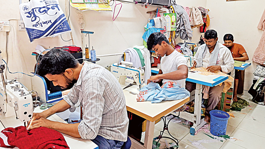 Tailors are engaged in round-the-clock shifts making clothes for their customers. The photos were taken from the New Market area in the capital and Barishal city, respectively, yesterday. Photo: Amran Hossain, Titu Das