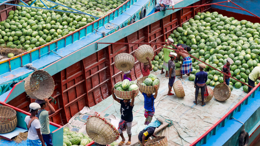 Workers unload watermelons brought by boats from Bhola to Khulna. During Ramadan, the demand for watermelons remains high. So, traders bring large quantities through river routes and sell them at a wholesale rate of Tk 6,000-Tk 25,000 per 100 pieces, depending on the size. The photo was taken from the No-4 Rocket Ghat in Khulna’s Boro Bazar area recently. Photo: Habibur Rahman
