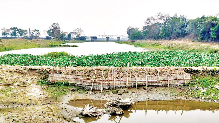 Titas under onslaught... A syndicate of illegal soil traders has constructed a road-like embankment, obstructing the natural flow of the Titas river in Brahmanbaria’s Akhaura upazila. They have also carved out roads through farmlands and the river to facilitate the transportation of illegally extracted soil from the riverbed. Story on page 5. PHOTO: MASUK HRIDOY