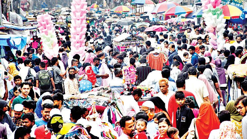 As Eid approaches, people are hurrying to complete the shopping for their families and friends. The photo was taken near the capital’s Gausia Market yesterday where the entire street is full of shoppers and hawkers. Photo: Palash Khan