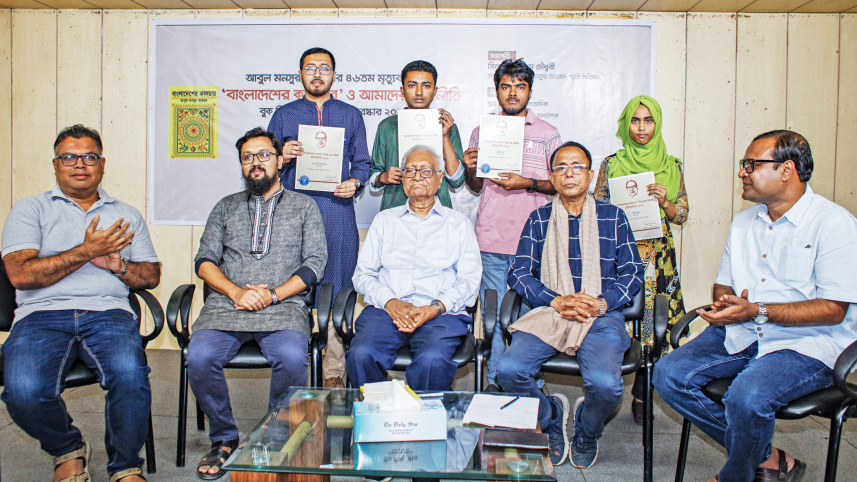Prof Serajul Islam Choudhury with award recipients at the Abul Mansur Ahmad Book Review Competition 2025 award ceremony. Prior to the event, a discussion was held marking the 46th death anniversary of the renowned South Asian writer, journalist, and politician Abul Mansur Ahmad at The Daily Star Centre yesterday. Photo: Rashed Shumon