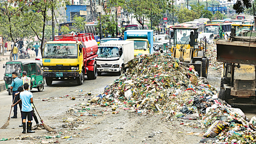 Demanding arrears, workers who collect household waste for the Dhaka North City Corporation staged a protest on Progati Sarani yesterday by dumping garbage onto the road at Notunbazar. With heaps of garbage blocking the city thoroughfare, there was slow traffic in the area and the adjacent areas all afternoon. Photo: Prabir Das
