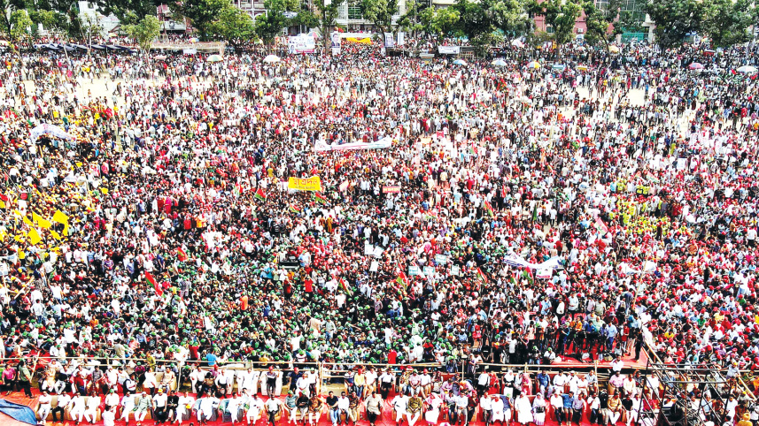 Thousands of BNP leaders and activists from different districts of Khulna and Barishal divisions throng Khulna Metropolitan Circuit House Ground for the party’s youth rally yesterday. Photo: Habibur Rahman