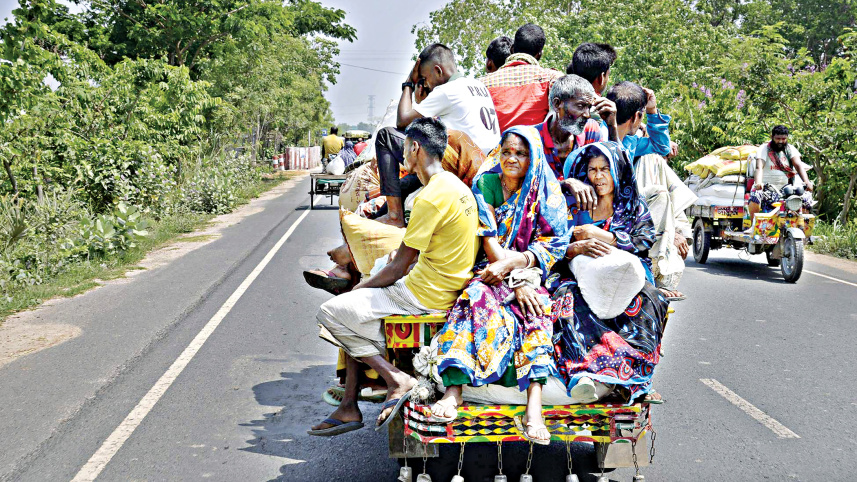 A battery-run vehicle crammed with passengers on the Rajshahi-Naogaon highway despite a ban on such vehicles on the highways. Casualties in collisions between these vehicles and buses and trucks have become common. This photo was taken in Delwabari area of Manda upazila in Naogaon yesterday. Photo: Azahar Uddin