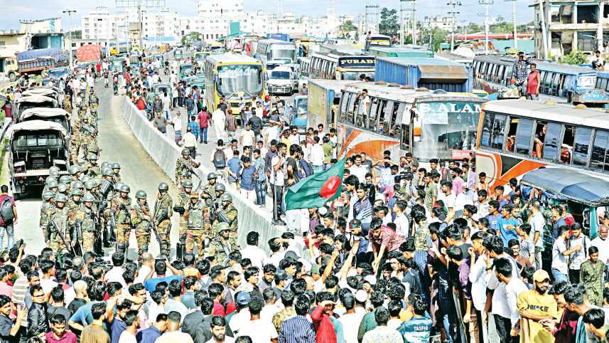 Vehicles remain stranded as activists of Students Against Discrimination (SAD) block the Cox’s Bazar-Chattogram highway yesterday, demanding the removal of the Patiya Police Station officer-in-charge. The protest followed Tuesday night’s clashes between SAD activists and police. The photo was taken at Indropole in Chattogram’s Patiya upazila around 5:00pm. Photo: Rajib Raihan