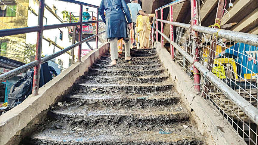 The broken and slippery staircase of Babubazar Bridge beside Sir Salimullah Medical College in Old Dhaka remains a daily hazard for thousands commuting between Dhaka and Keraniganj due to poor maintenance. The photo was taken yesterday. PHOTO: RASHED SHUMON