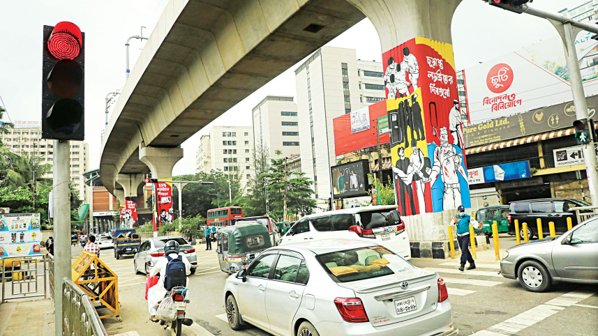 The government’s pilot programme to install semi-automatic traffic signals at seven intersections in Dhaka began yesterday. This photo, taken on the capital’s Minto Road near Hotel Intercontinental, shows commuters ignoring the red signal and passing through. PHOTO: AMRAN HOSSAIN