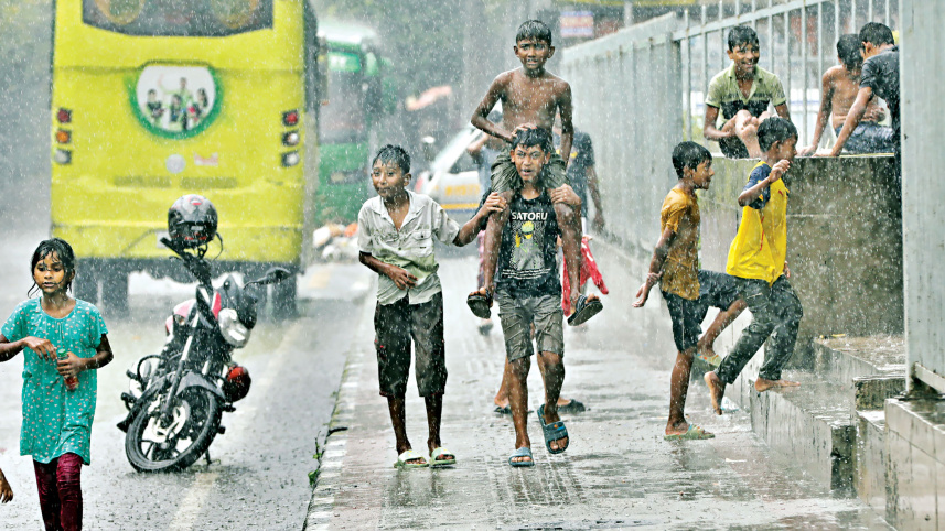 Local children revel in yesterday’s sudden rain, joyfully playing on a footpath in Agargaon, Dhaka, as a welcome relief from the heat.