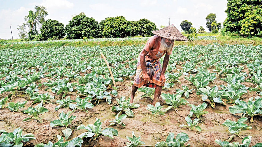A farmer tends to his cauliflower field at Phulbari village in Godagari upazila of Rajshahi. Farmers are already cultivating winter vegetables including cauliflower and cabbage, hoping to fetch higher prices in the market. The photo was taken recently.