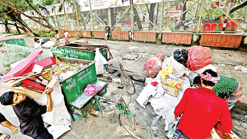 While children play inside Kalabagan Shishu Park, trash collectors dump and sort waste on the street outside before moving it to a garbage depot next to the field, exposing them to foul odour and pollution in one of the capital’s few leisure spaces. Photo: Prabir Das