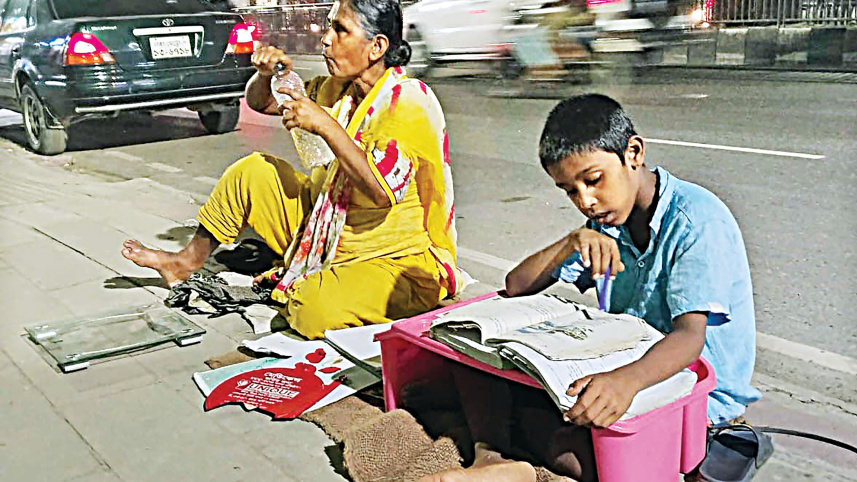 True grit ... Every evening, little Dip, a second grader under the education programme of Holy Cross School, carries his books to a pavement in the capital’s Tejturi Bazar to study. While his mother, Mitali Rani Das, earns by weighing passers-by on a scale, Dip’s determination to study shines brighter than the traffic around him. They have no home but a staircase corner -- yet his dream refuses to dim. The photo was taken around 8:00pm on Monday. PHOTO: AMRAN HOSSAIN