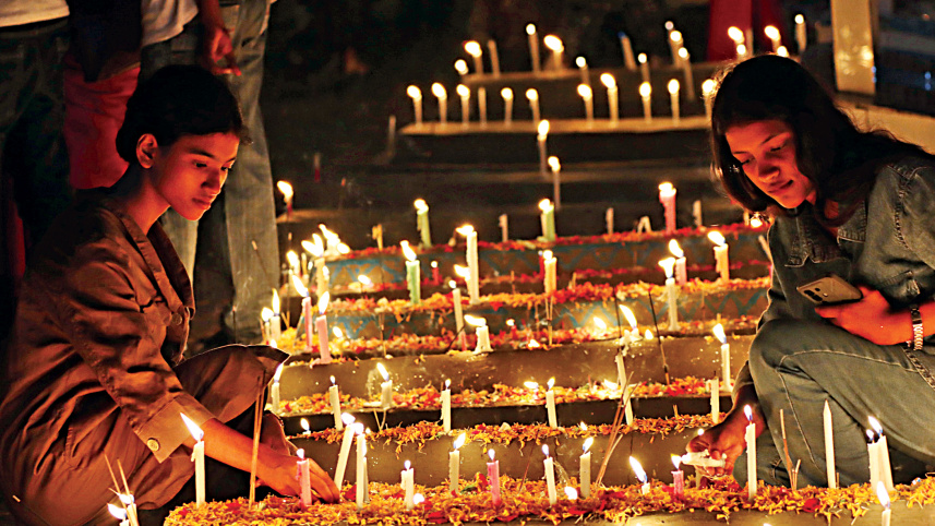 Two women light candles on the grave of a deceased family member at the Baptist Church Cemetery on Band Road in Barishal yesterday, marking All Souls’ Day. Members of the Christian community observe the day by offering prayers, lighting candles, and placing flowers on the graves of their loved ones. Photo: Titu Das