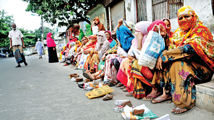Women wait for a TCB truck to buy essentials at subsidised rates in Rajshahi city’s Shiroil area yesterday. Many of the low-income group flock to TCB distribution points across the city early in the morning, fearing they may miss out on the limited supply. The photo was taken around 7:00am, though distribution was scheduled to begin at 10:00am. Photo: Azahar Uddin