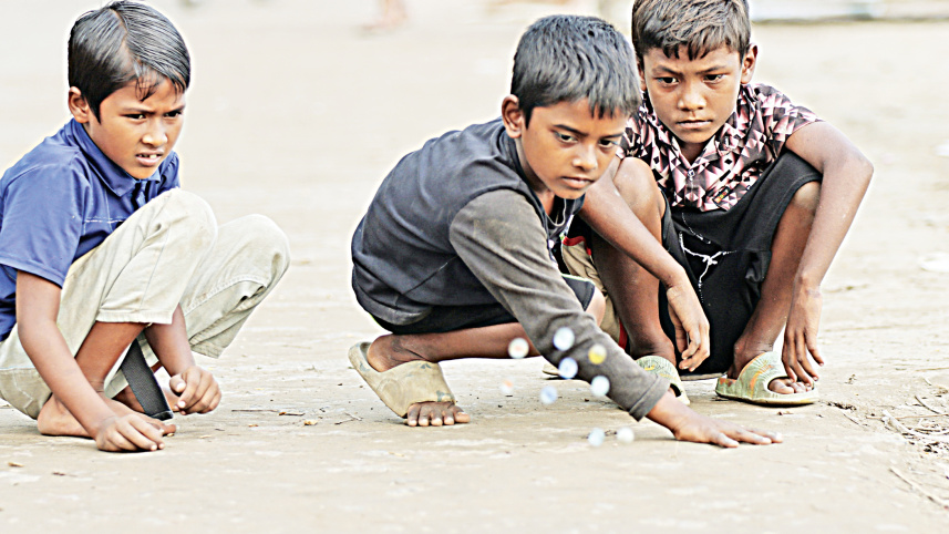 Three completely transfixed children play a game of marbles in the Chandmari area of Barishal, sharing in the joy of this popular and enduring pastime. The photo was taken yesterday. Photo: Titu Das