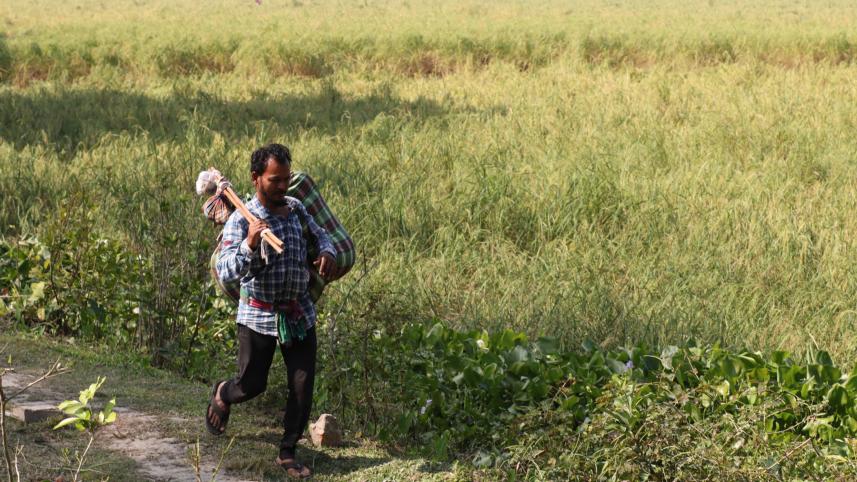 Md Monir Taj goes door to door in rural areas, making quilts, mattresses, and pillows to earn his living. Between the Bangla months of Kartik and Magh, the 45-year-old earns around Tk 50,000 to Tk 60,000. The photo was taken in the Purbo Charadi area of Bakerganj, Barishal yesterday. Photo: Titu Das