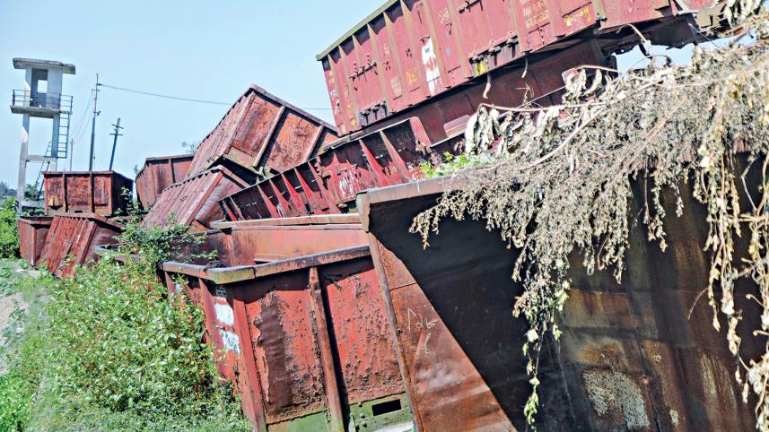 Wagon units and freight equipment worth crores of taka have been lying neglected in the open for years in Halishahar, Chattogram. Exposure to sun, rain, and mud has left most of them rusted and covered in vines. The photo was taken yesterday. Photo: Rajib Raihan