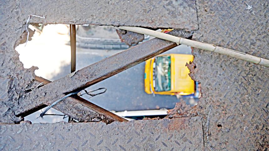 Pedestrians use this footbridge in the capital’s Shahbagh area unaware of the dangerous hole on its walkway. Although some people have tried to cover or block it, the gap still poses a serious risk to anyone who might step into it. The photo was taken yesterday. Photo: Firoz Ahmed