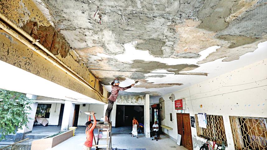 Workers renovating Dhaka University’s Haji Muhammad Mohsin Hall, one of the old and vulnerable halls that underwent a post-earthquake inspection, yesterday. An engineering team led by Buet Professor Ishtiaq Ahmed began inspecting risky DU halls on Sunday. Other such halls are also expected to undergo renovation. PHOTO: PRABIR DAS