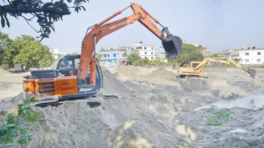The local administration re-excavates this illegally filled pond in Rajshahi city’s Mollapara area to return it to its original state. A joint effort by the divisional commissioner, city corporation, Department of Environment, and police stopped the illegal activity. Photo: Azahar Uddin