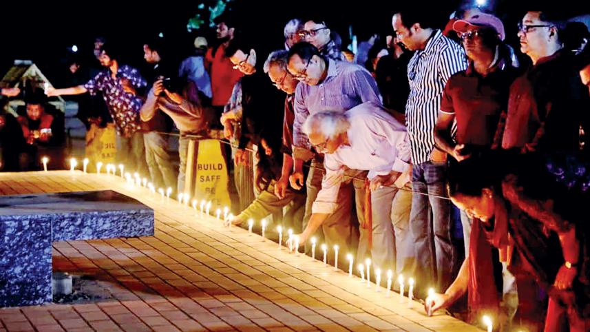 Leaders and activists of Bangladesh Chhatra Union, Jubo Union, and Udichi Shilpigoshthi light candles at the Shikha Chironton in Suhrawardy Udyan yesterday to mark the beginning of the month of victory. They arrived at Suhrawardy Udyan in a torchlight procession that started in front of the Shilpakala Academy. Photo: Star