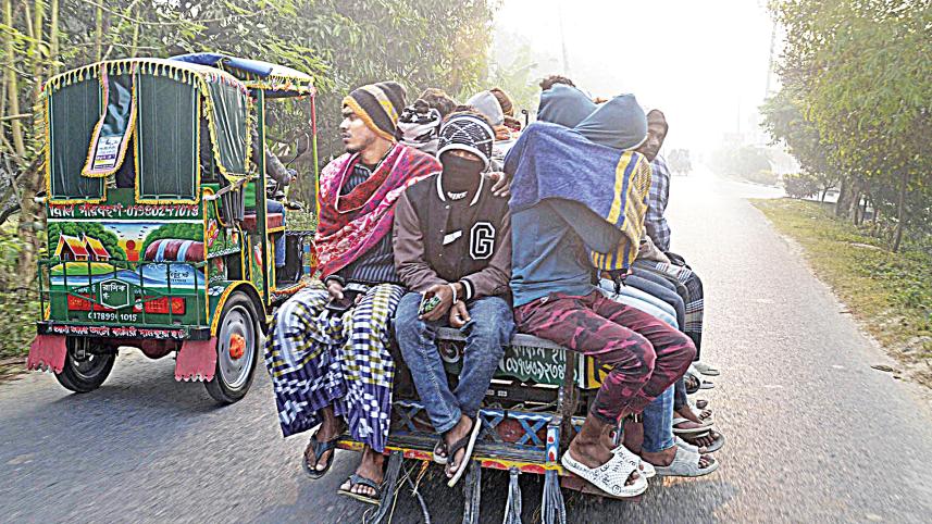Amid cold and foggy weather, labourers huddle on a three wheeler, as they head to Rajshahi city in search of work. The chill has already gripped the northern region. The photo was taken around 8:00am yesterday in Paba upazila of Rajshahi. Photo: Azahar Uddin