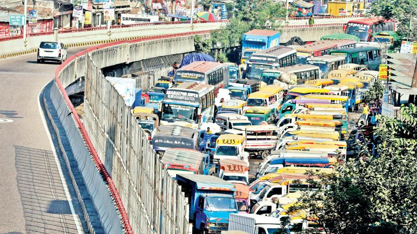 Long-route buses and trucks struggle to enter the capital beneath the Jatrabari-Gulistan flyover due to an illegal leguna stand, causing heavy traffic and delaying commuters. The photo was taken in the Jatrabari area yesterday. Photo: Anisur Rahman