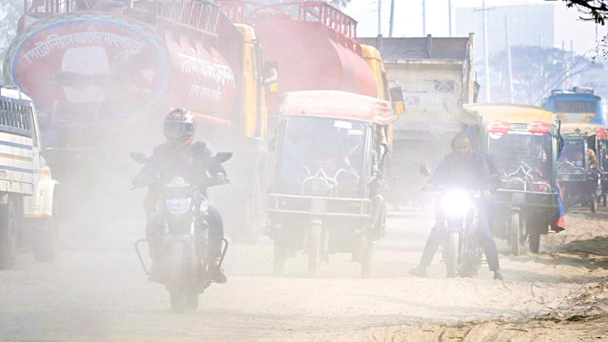 Dust blankets the Tikrabadh area on Khulna-Satkhira highway. With sand, gravel, and other repair materials left exposed, the movement of vehicles kicks dust into the air. The photo was taken yesterday. Photo: Habibur Rahman