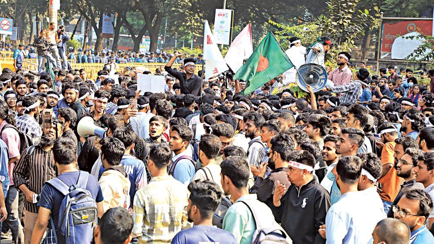 A group of students from the seven government colleges in Dhaka holds a sit-in in front of Shikkha Bhaban, demanding prompt implementation of the Dhaka Central University Ordinance. Police set up barricades and suspended vehicular movement towards the Secretariat due to the protest, causing traffic congestion and suffering to commuters. The photo was taken yesterday noon. Photo: Amran Hossain