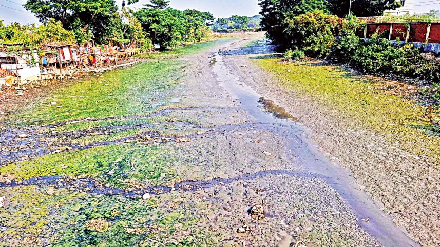 With winter setting in, the water level of the Kirtankhola has dropped significantly, leaving the adjoining canal in Barishal city’s Rasulpur area dried out and reduced to a narrow, sludge-filled strip. The photo was taken yesterday. PHOTO: TITU DAS