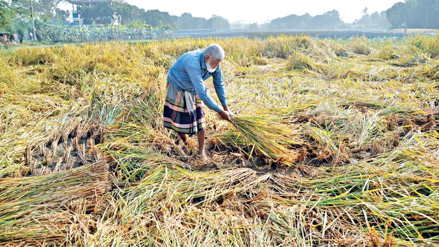 A farmer struggles to harvest Aman paddy as stagnant water remains in his field. Even a month after the last heavy rainfall, farmers across Rajshahi are still struggling to fully harvest their Aman crops. The photo was taken near the Nawhata-Borgachi road in Paba upazila of Rajshahi yesterday. Photo: Azahar Uddin