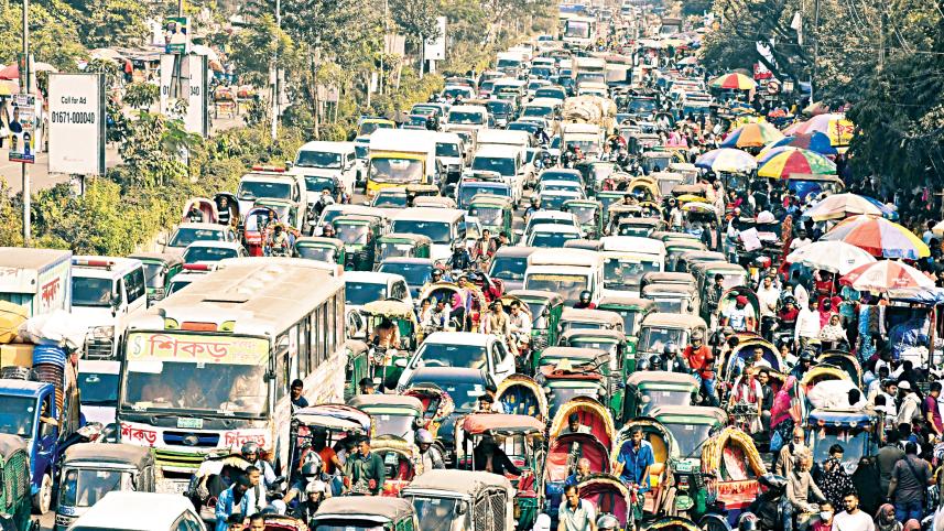 Severe tailbacks formed on one side of Mirpur Road yesterday after mobile phone traders and employees blocked the Shyamoli-Agargaon Link Road to press home their six-point demand, causing immense suffering to commuters. The photo was taken near Shishu Hospital. PHOTO: PALASH KHAN