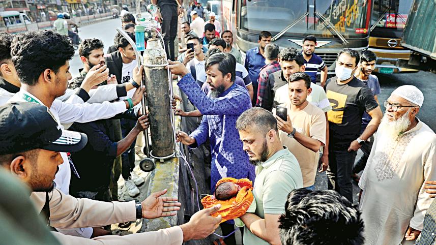People help a family carry a sick newborn whose ambulance got stuck in a jam near Shanir Akhra on the Dhaka-Chattogram highway in the capital yesterday. The ambulance taking the critically ill child from Dhanmondi to Bangladesh Neonatal Hospital in Narayanganj was stuck as locals blocked the highway demanding uninterrupted gas supply. Photo: Star
