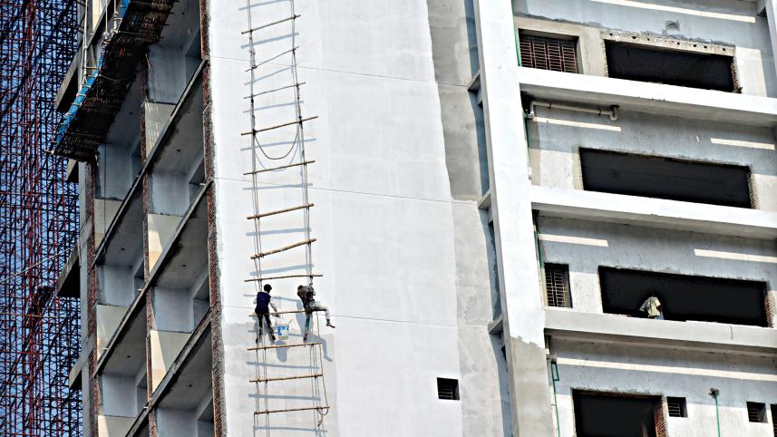 Without any safety harness, two workers are painting a 17-storey building, hanging precariously from a makeshift ladder, in Barishal city. The photo was taken yesterday. Photo: Titu Das
