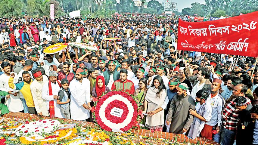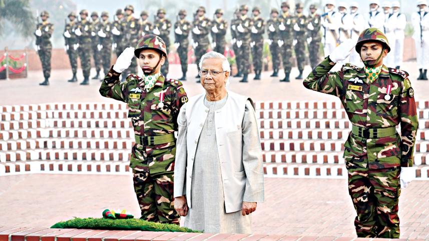 Chief Adviser Professor Muhammad Yunus lays a wreath at the National Memorial in Savar, Dhaka, paying tribute to the martyrs of the 1971 Liberation War on the occasion of Victory Day yesterday. Photo: CA’s Press Wing, Prabir Das, Palash Khan