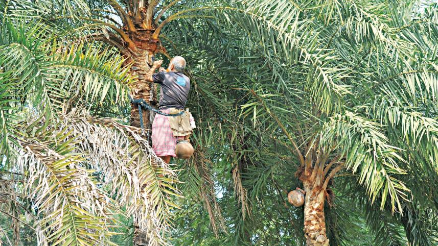 A farmer prepares a tree before attaching a jar to collect date juice. This is the prime season for harvesting the precious syrup. The photo was taken in the Fatepur area of Charghat, Rajshahi, yesterday. Photo: Azahar Uddin