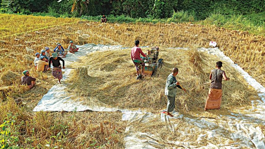 Indigenous farmers of Bandarban are seen processing a paddy variety locally known as “Lakcha”. An integral part of the social life and cultural heritage of indigenous communities in the region, villagers work together by exchanging labour, with no financial motive, to preserve the paddy. The photo was taken recently. PHOTO: MONG SING HAI MARMA