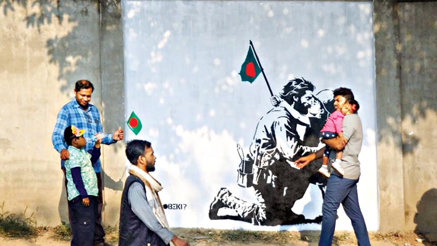 SUBODH RETURNS: Anonymous graffiti artist, known only by the tag “Hobeki?”, revived the iconic Subodh series yesterday on the nation’s 54th Victory Day. In the new mural on the Air Force wall in the capital’s Agargaon, a man whose waist belt holds a paintbrush and spray can embraces a little girl wearing a helmet and carrying the national flag. The Subodh series first appeared at this very spot in 2017, with its last mural seen on August 5, 2024. Photo: UNB