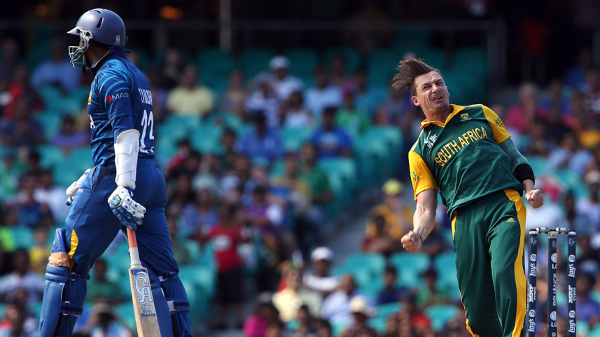 South Africa's Dayle Steyne (R) celebrates after dismissing Sri Lanka's Tillakaratne Dilshan for a duck during their Cricket World Cup quarter-final match at the Sydney Cricket Ground (SCG) March 18, 2015. Photo: Reuters