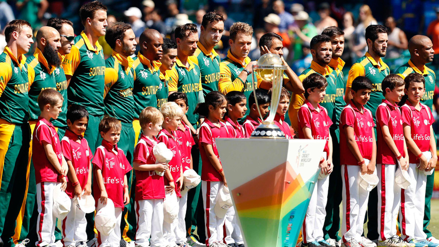 Members of the team from South Africa stand together during the playing of the national anthems before the start of their Cricket World Cup quarter-final match against Sri Lanka at the Sydney Cricket Ground (SCG) March 18, 2015. Photo: Reuters