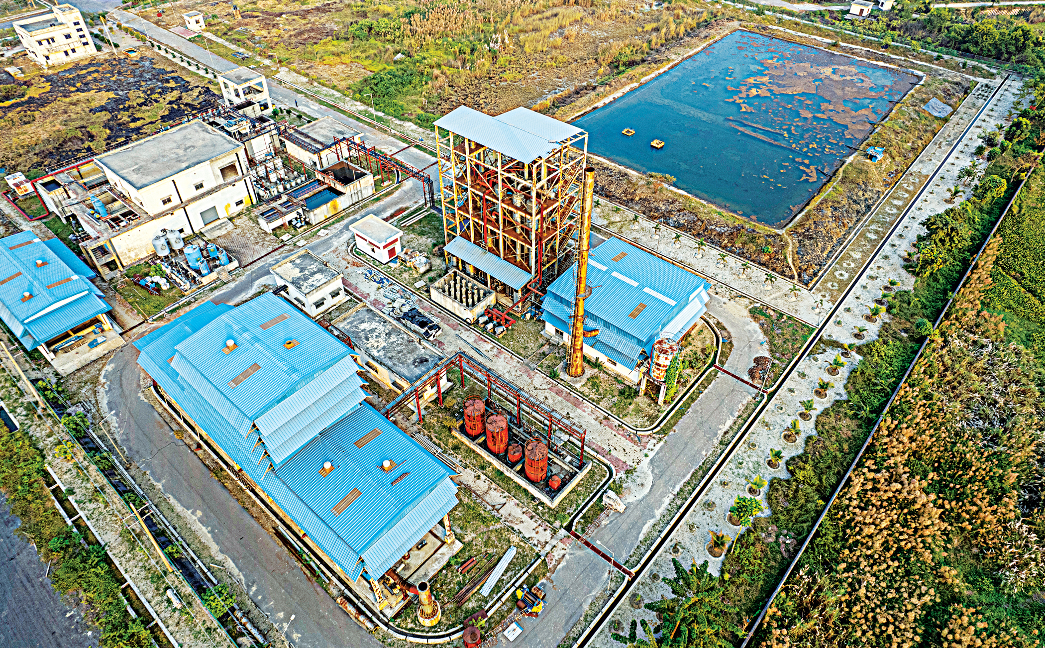 An aerial view of the park’s infrastructure, featuring the Tk 80 crore central effluent treatment plant. Designed to handle hazardous chemical waste for dozens of factories, the facility remains unused and deteriorating.