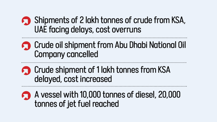 At least 1,00,000 tonnes of crude oil were supposed to be loaded into a tanker at Ras Tanura in Saudi Arabia. This shipment for Bangladesh is now being loaded at Yanbu, with an additional cost of $0.25 per barrel.
