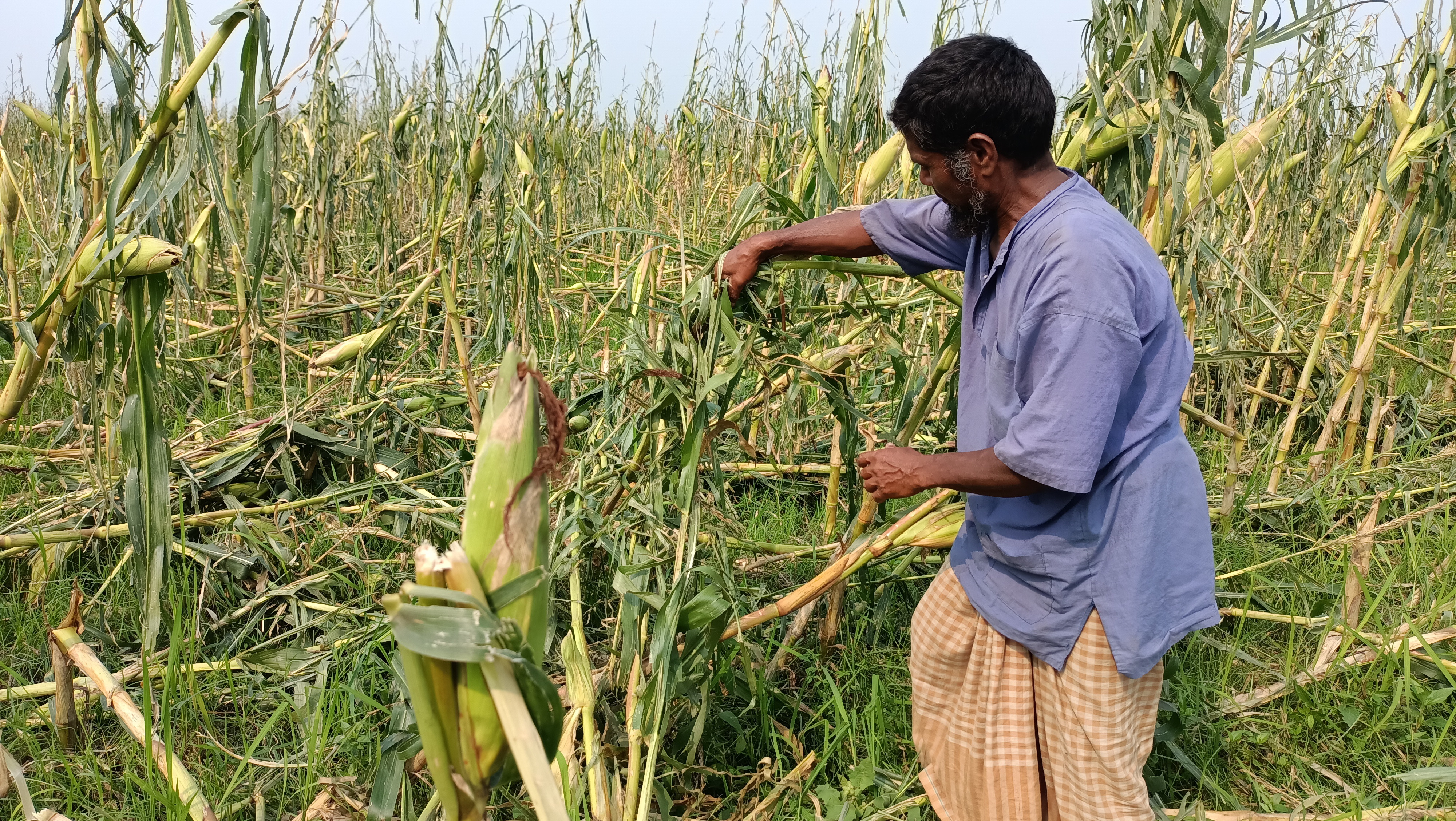 Shamsul Islam, 60, a farmer from the Burirhat area of the same upazila, said, “Three of my houses have collapsed. Most of the maize on my ten bighas of land has been destroyed by hail.”