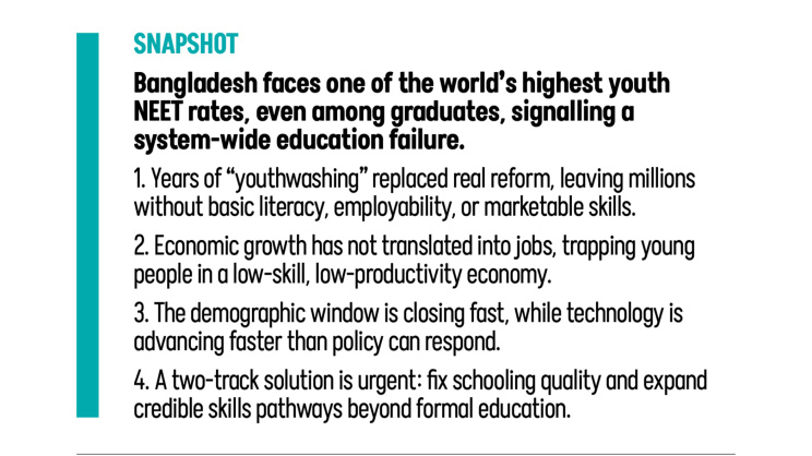 At a time when public education spending stagnated and remained among the lowest in the world, taxpayers’ money was wasted through symbolic budgetary allocations in the name of youth empowerment—a tragic phenomenon that I previously described as “youthwashing”. Rhetorical commitment without credible budgets, clear delivery plans, and measurable outcomes has left a generation dangerously exposed. Today millions have completed schooling without foundational qualifications; half of ten-year-olds cannot read an age-appropriate sentence; and Bangladesh remains near the bottom of global human capital rankings.